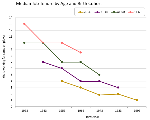 Look at how much less time each generation spends at their employer compared to the generations before! The decline from decade to decade is dramatic!